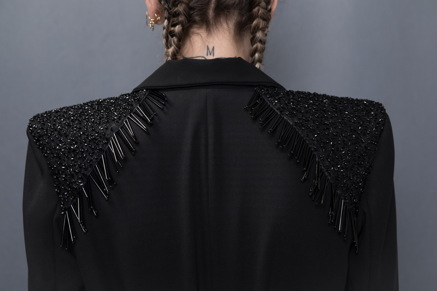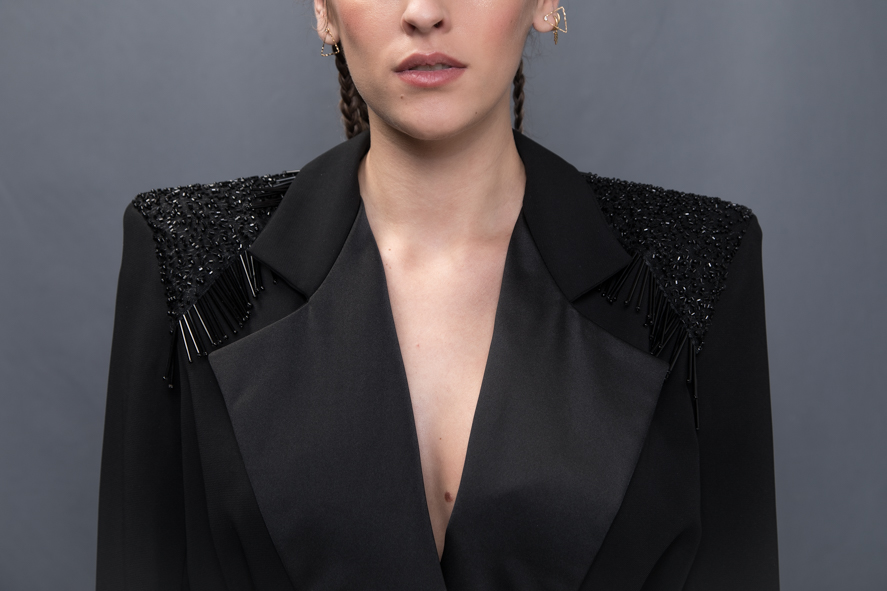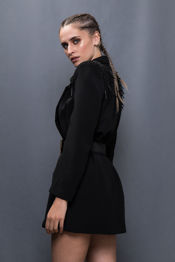 Descripción: Blazer/ vestido con solapa de raso y hombros de pedrería. Cinturón incluido. Lavado: Preferiblemente lavar a mano.
