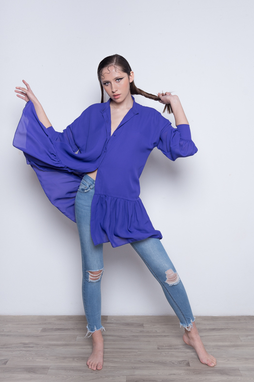 Descripción: Camisa oversize de gasa con volante y mangas abollonadas con puño. Lavado: Máquina másimo 30º