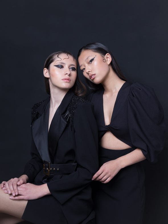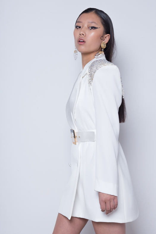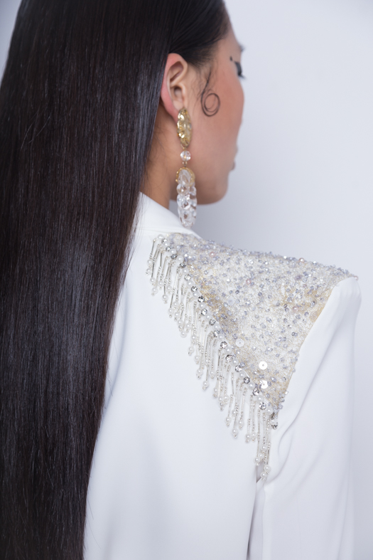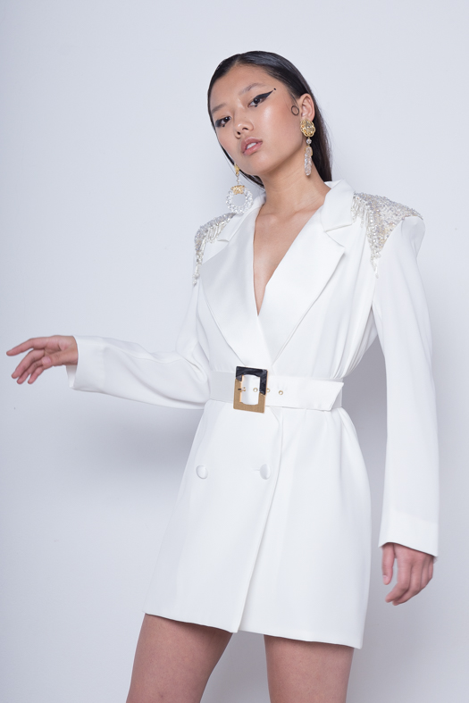 Descripción: Blazer/ vestido con solapa de raso y hombros de pedrería.