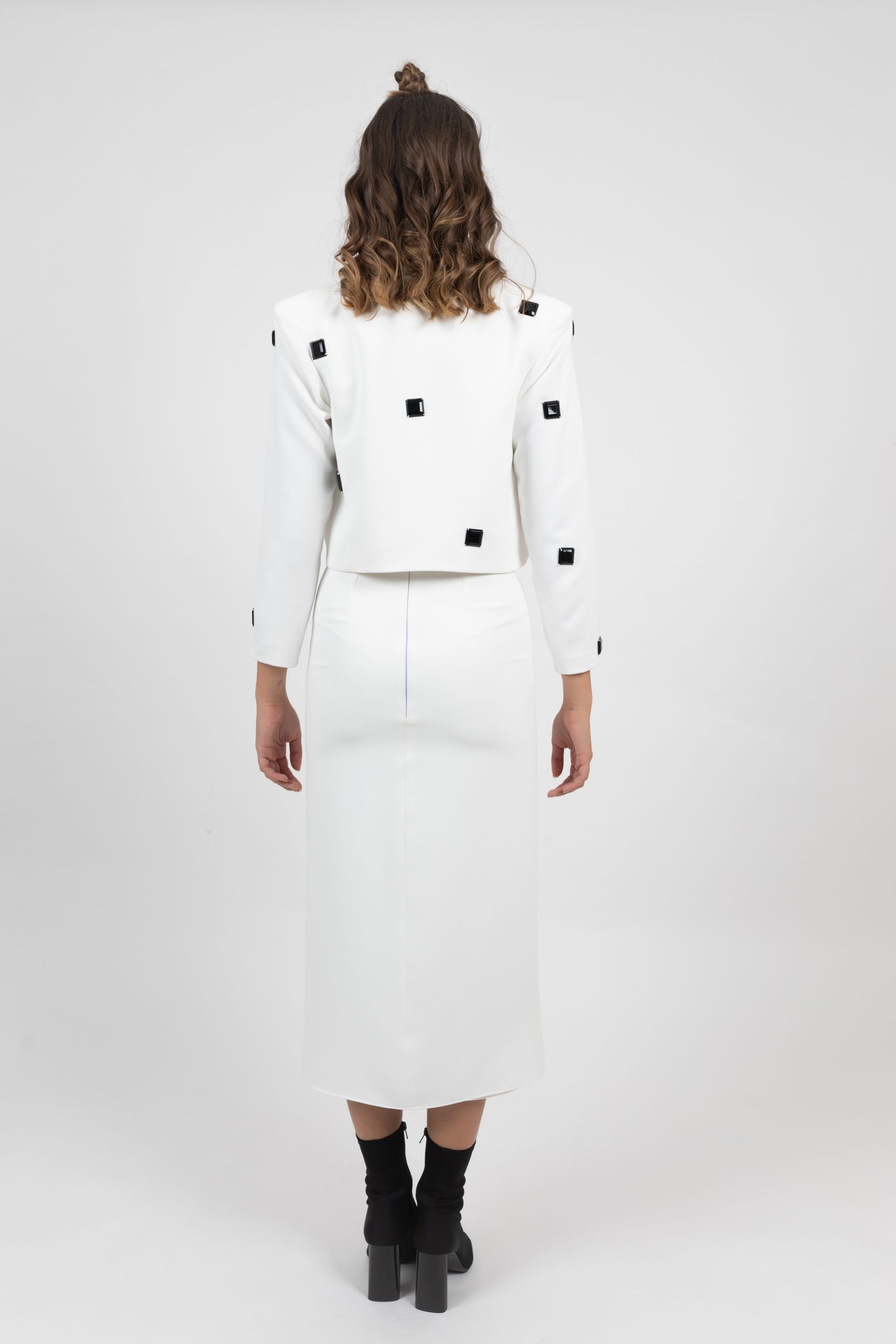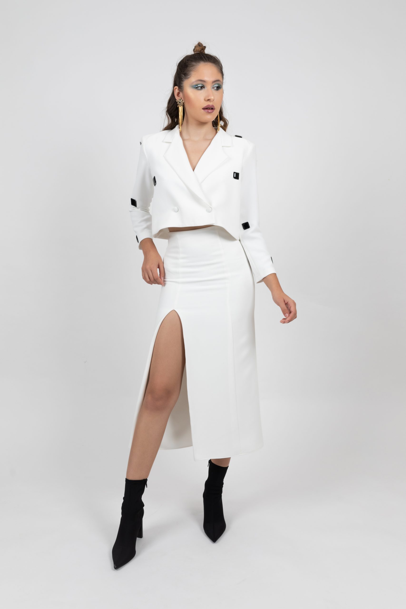Descripción: Falda de crep de punto, con abertura delantera, forrada, cintura alta.