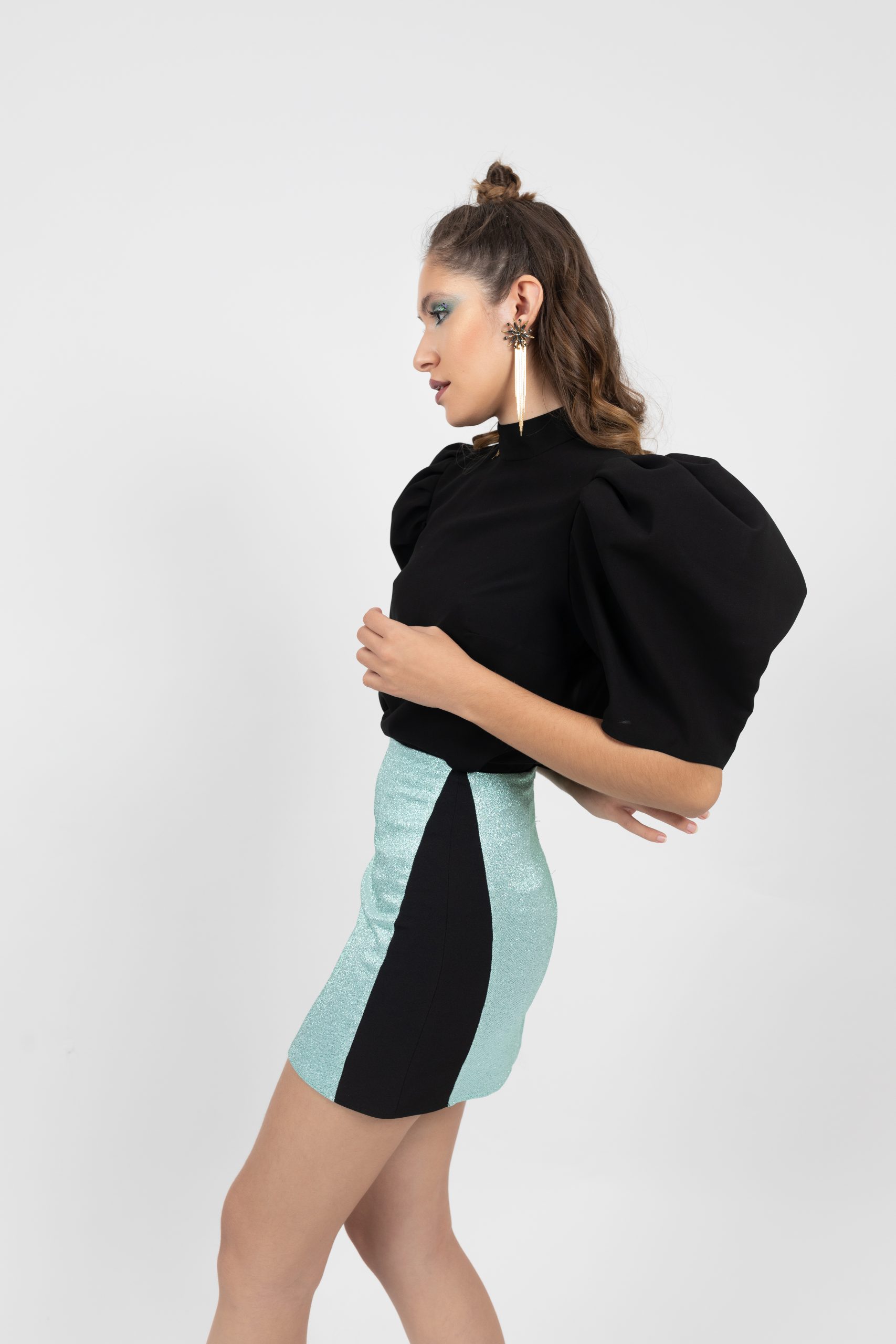 Descripción: Falda mini combinada, tejido brillo, cintura alta.