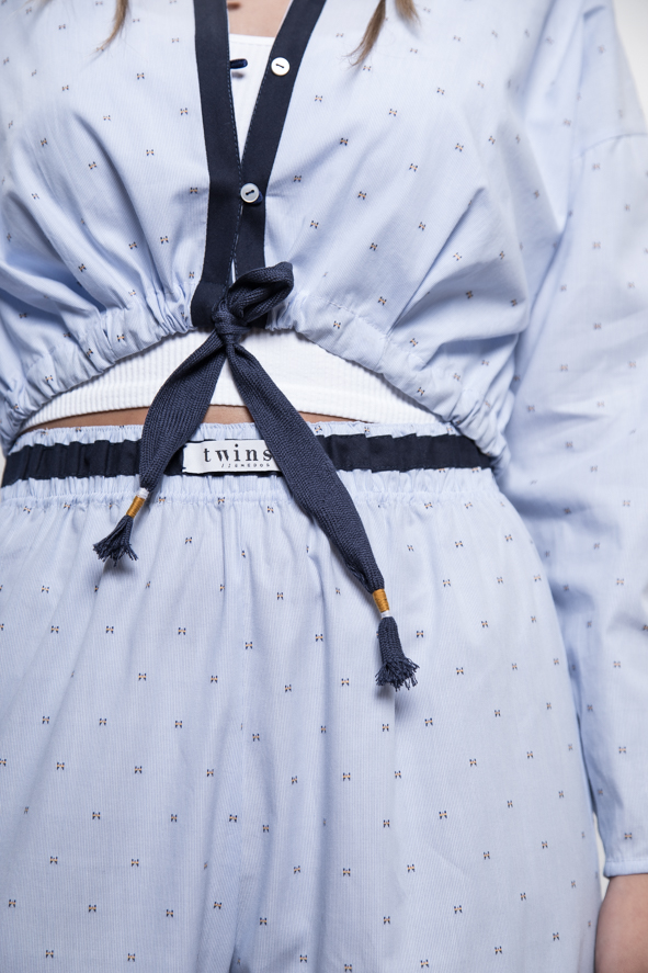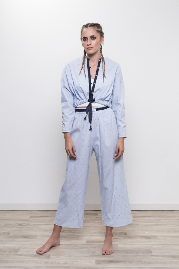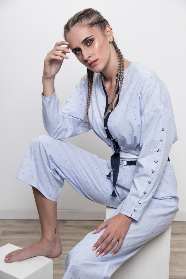 Descripción: Pijama de dos piezas con camisa abotonada y cintura ajustable. Pantalón ajustable.Tejido 100 % algodón. Incluye funda. Lavado: Máquina