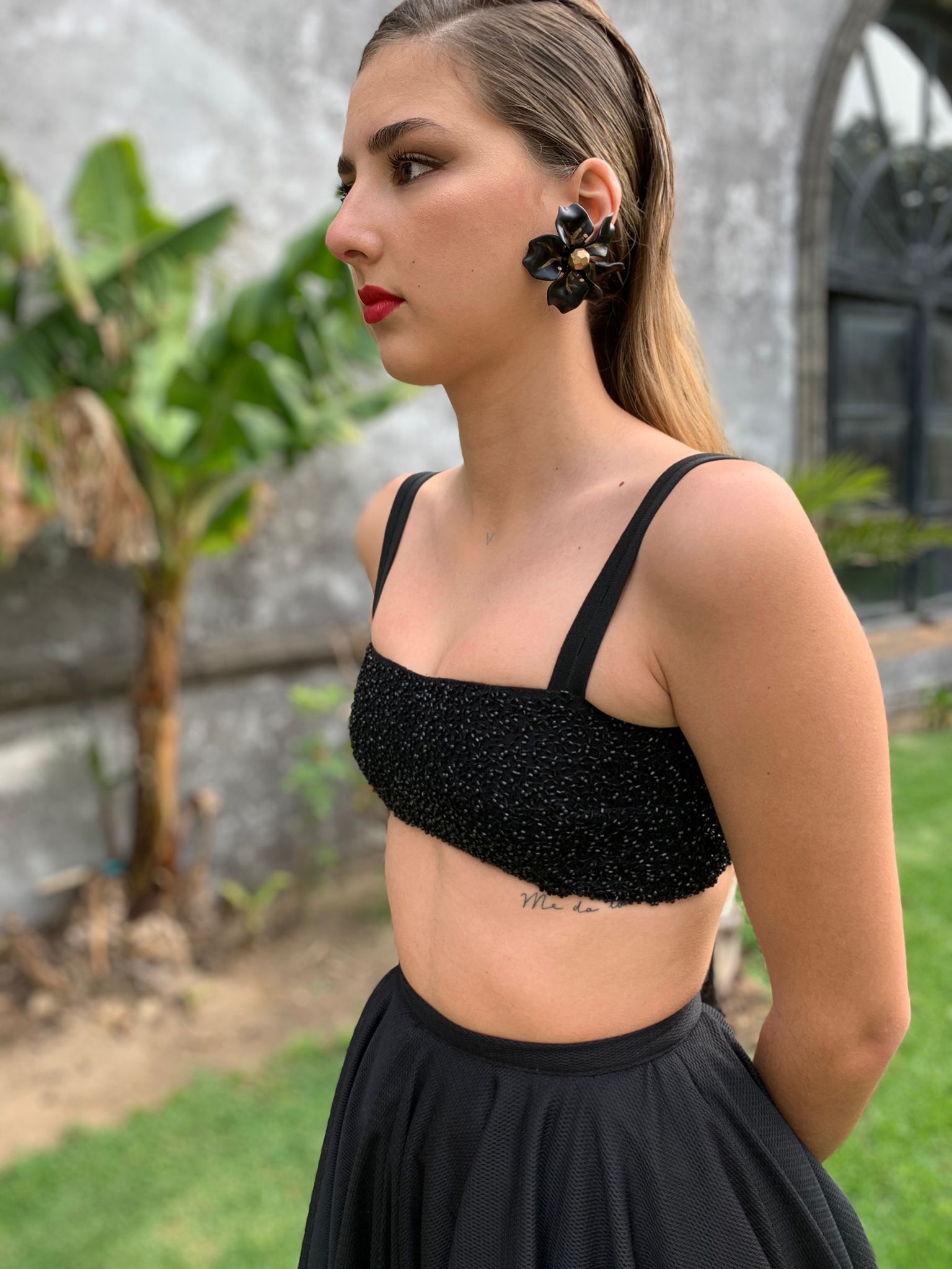 Descripción: Top crop de tejido de pedrería, forrado, tirantes elásticos y cierre elásticos.