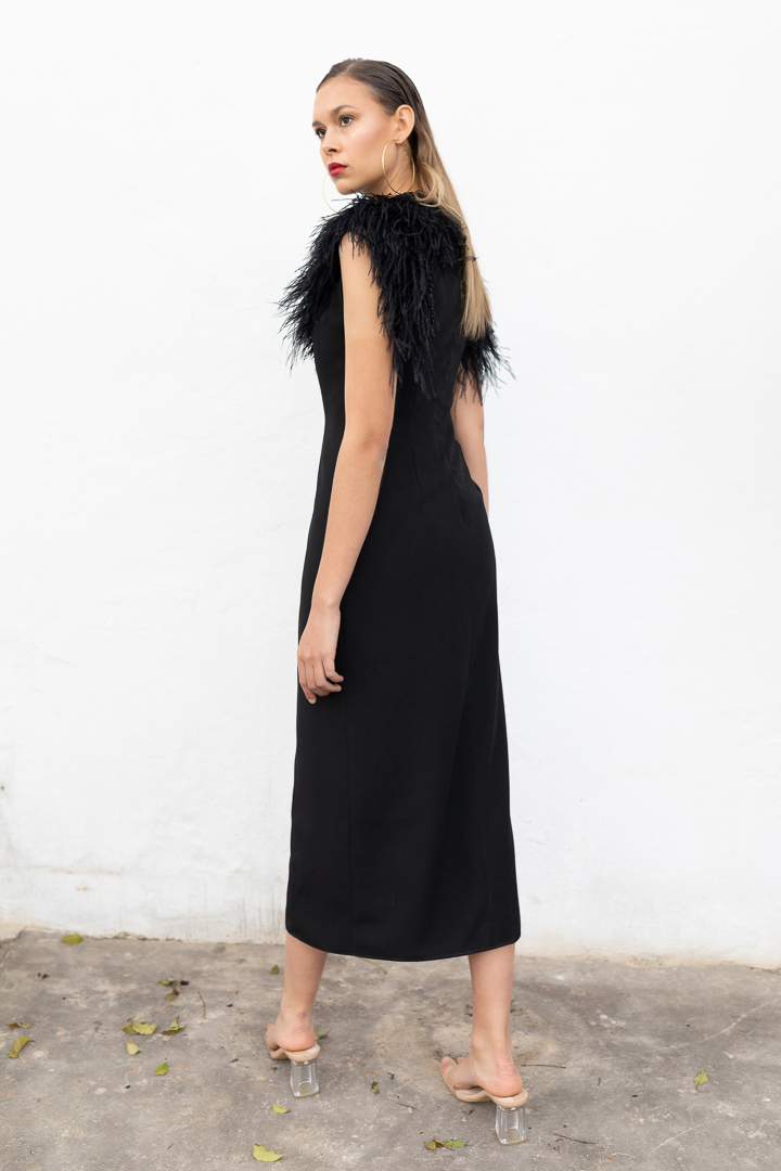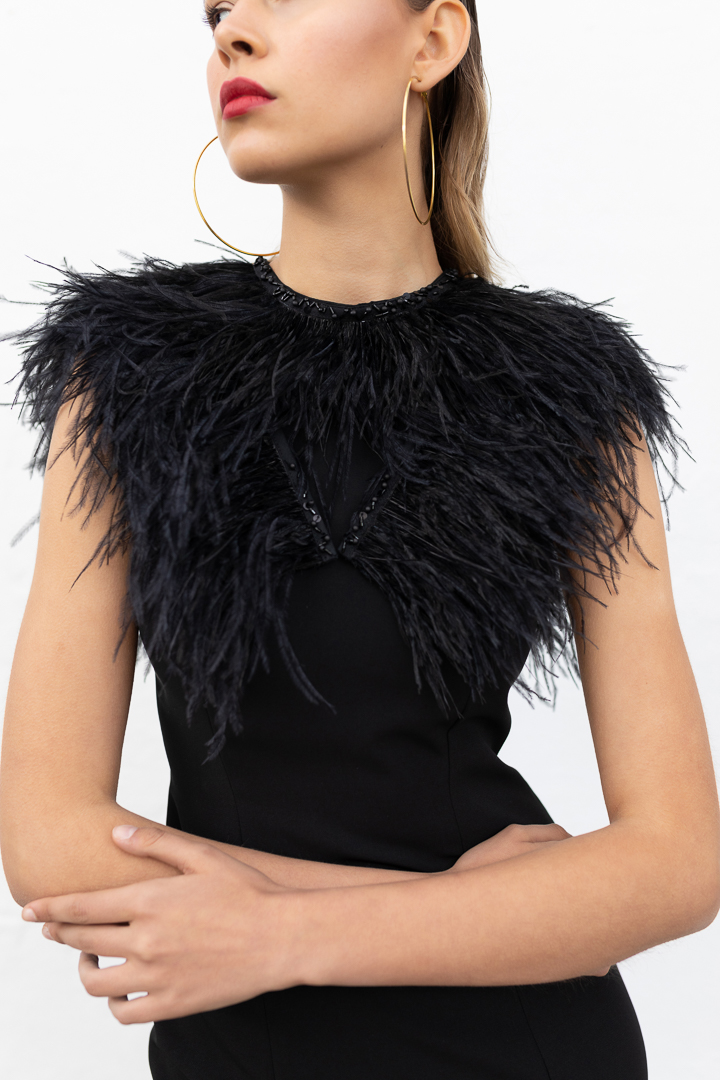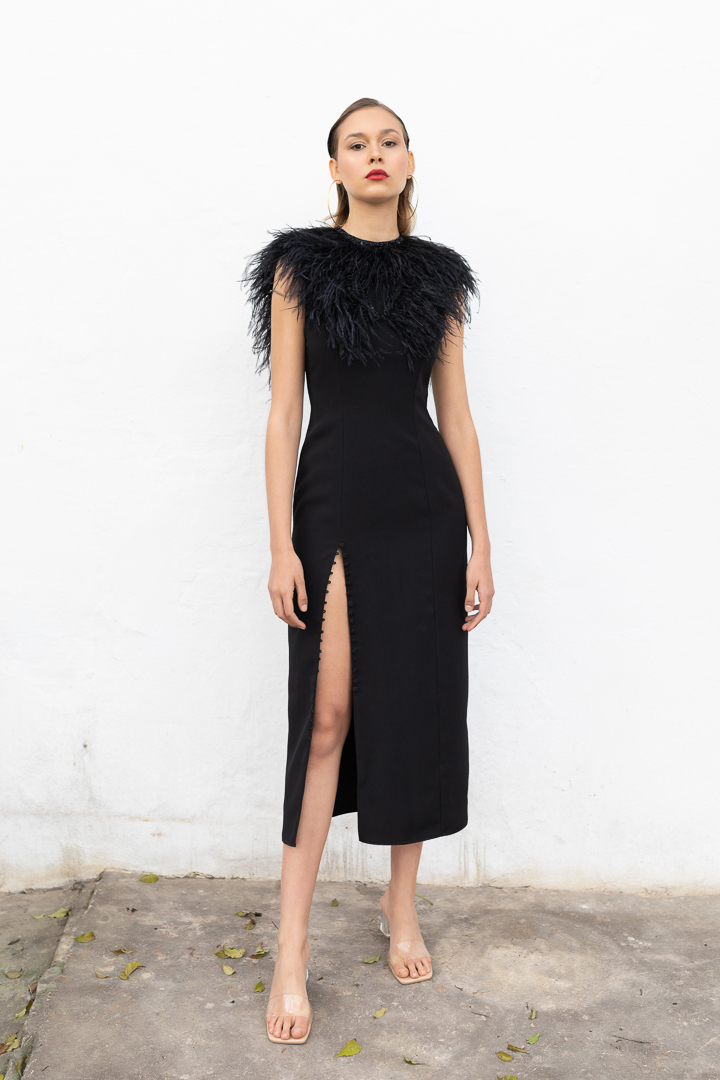 Descripción: Vestido negro, forrado, abertura con múltiples botones forrados, plumas, escote joya.