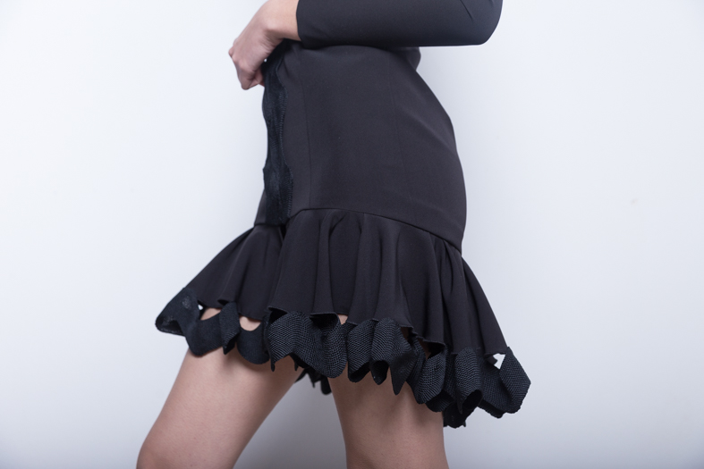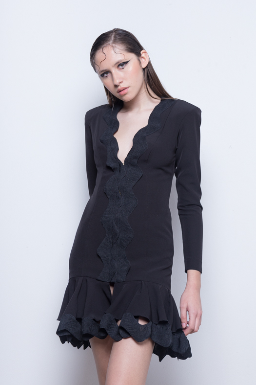 Descripción: Vestido negro con cremallera delantera y volante. Tejido politecno.